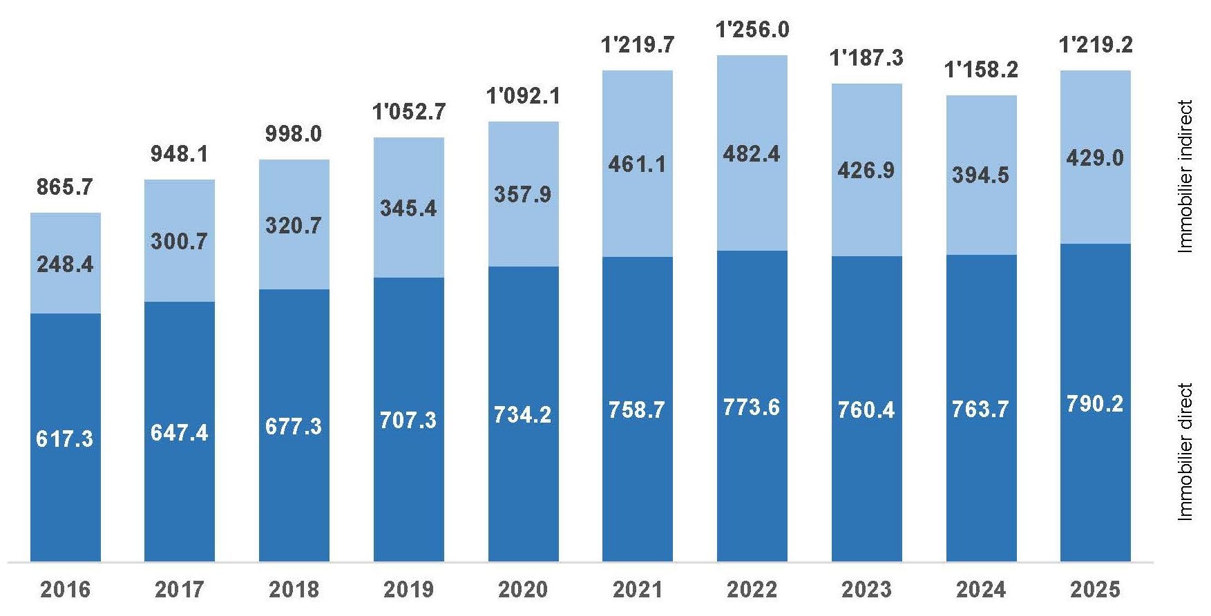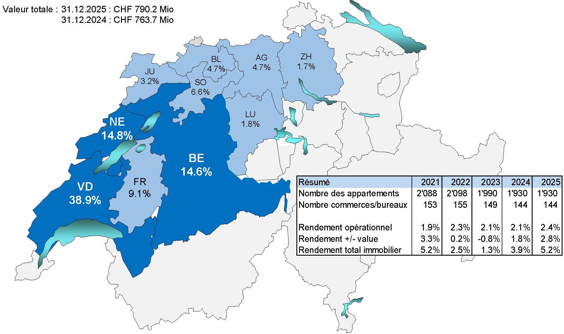 Statistiques immobilières au 31.12.2025 Placements immobiliers (directs et indirects)Valeur comptable en mio CHF Répartition par canton