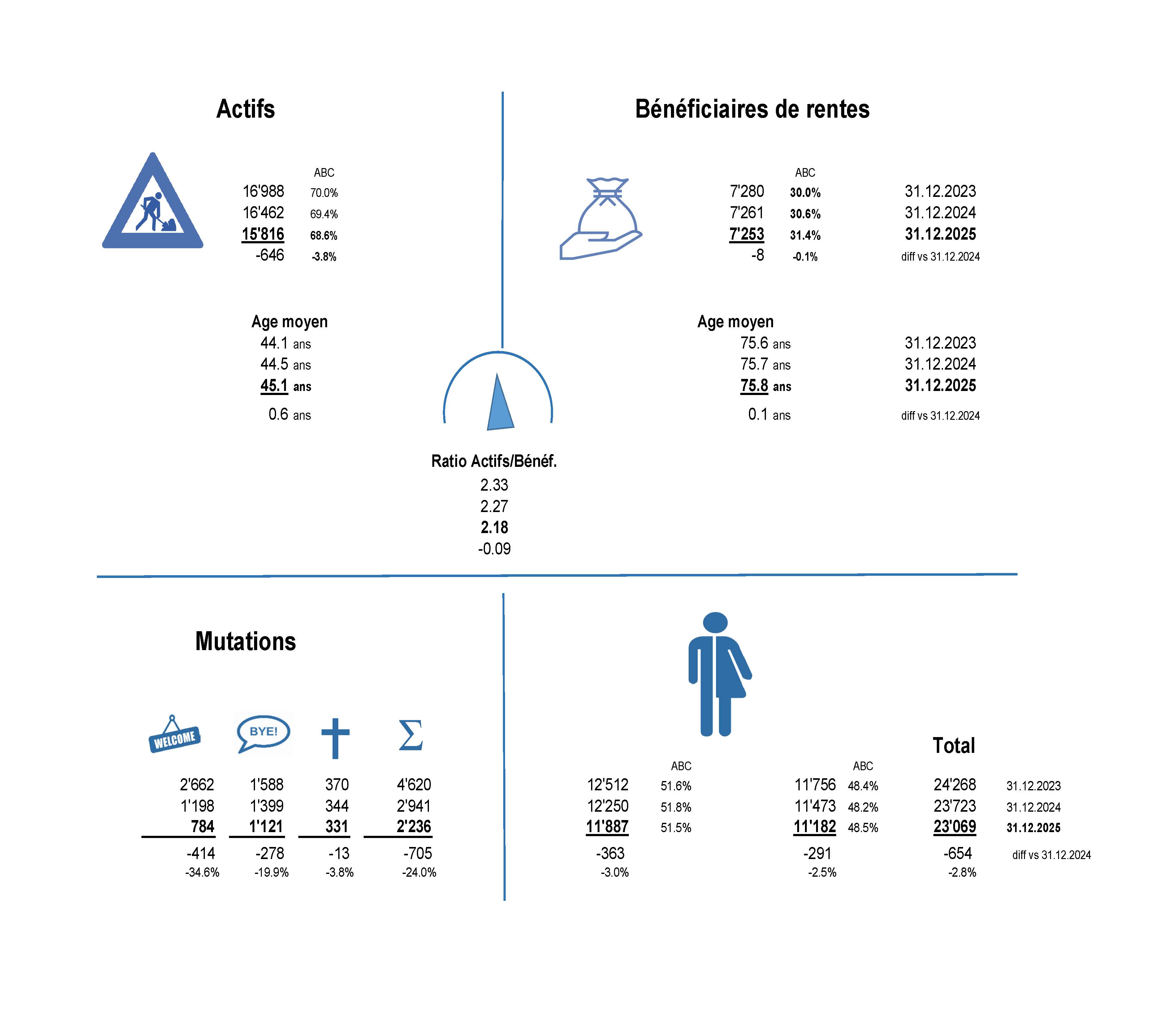 Effectif au 31.12.2025 Comparaison des effectifs et mutations sur 3 ans Structure démographique des assurés